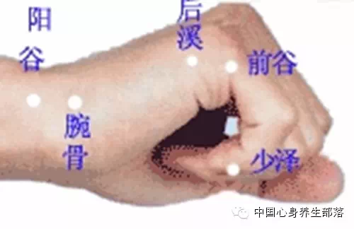 后溪穴:在小指尺侧,第5掌骨小头后方,当小指展肌起点外缘;中国心身养生部落 加微信号ZHGXSYSBL515关注