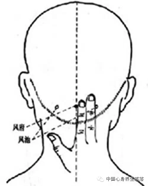 风府穴位于后颈部,两风池穴连线中点,颈顶窝处。