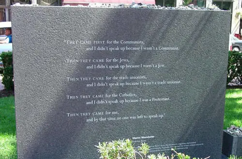 在德国,起初他们追杀共产主义者,我没有说话,因为我不是共产主义者;接着他们追杀犹太人,我没有说话,因为我不是犹太人;后来他们追杀工会成员,我没有说话,因为我是新教教徒;最后他们奔我而来,再也没有人站出来为我说话了。