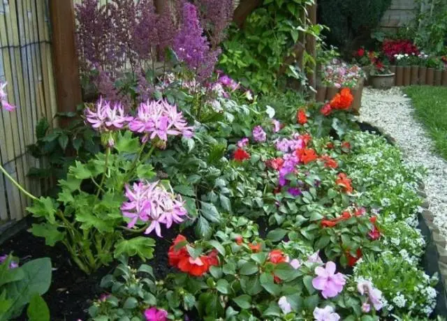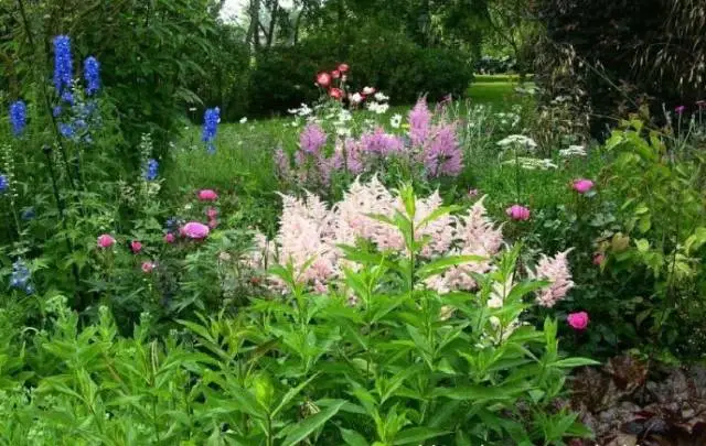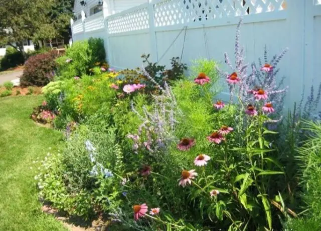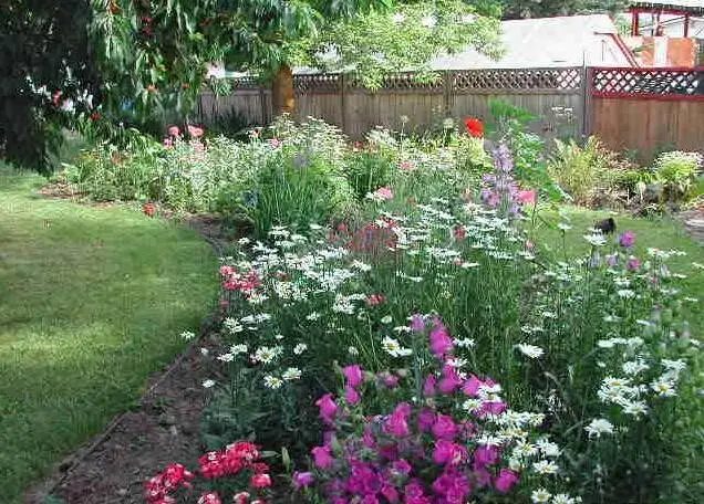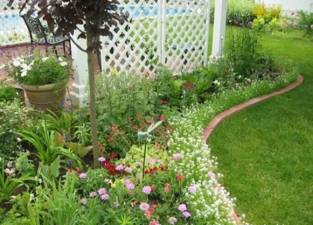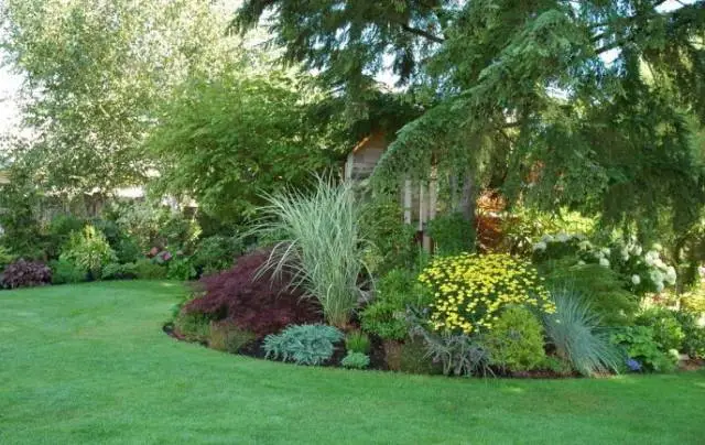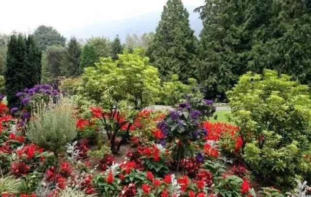 8.混合花境:以宿根花卉为主,配置少量灌木、球根花卉、针叶树或艺术小品等组成的花境。